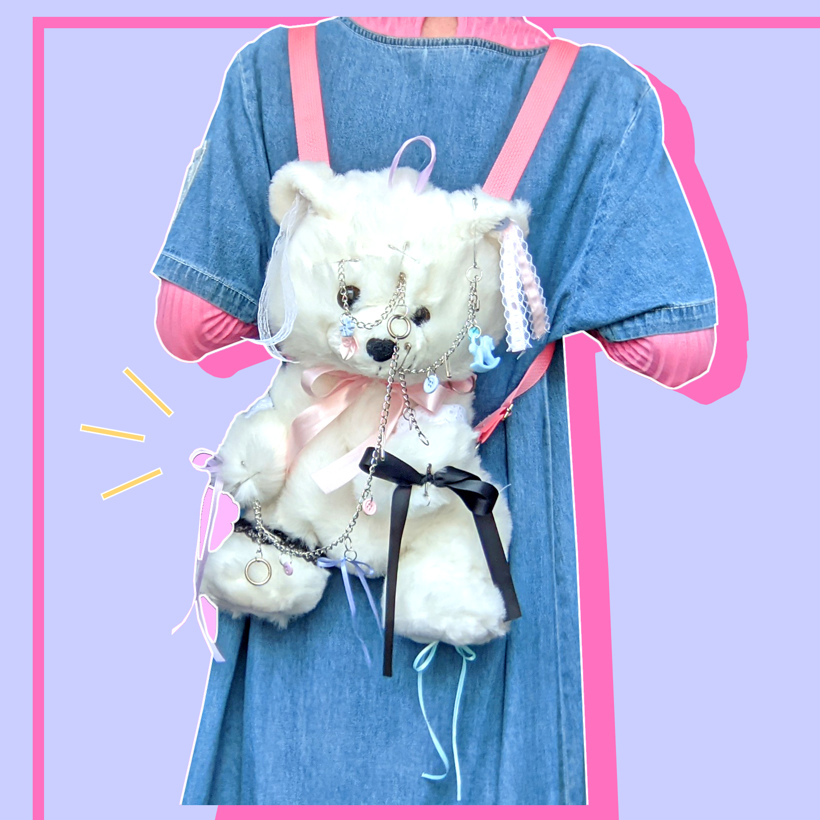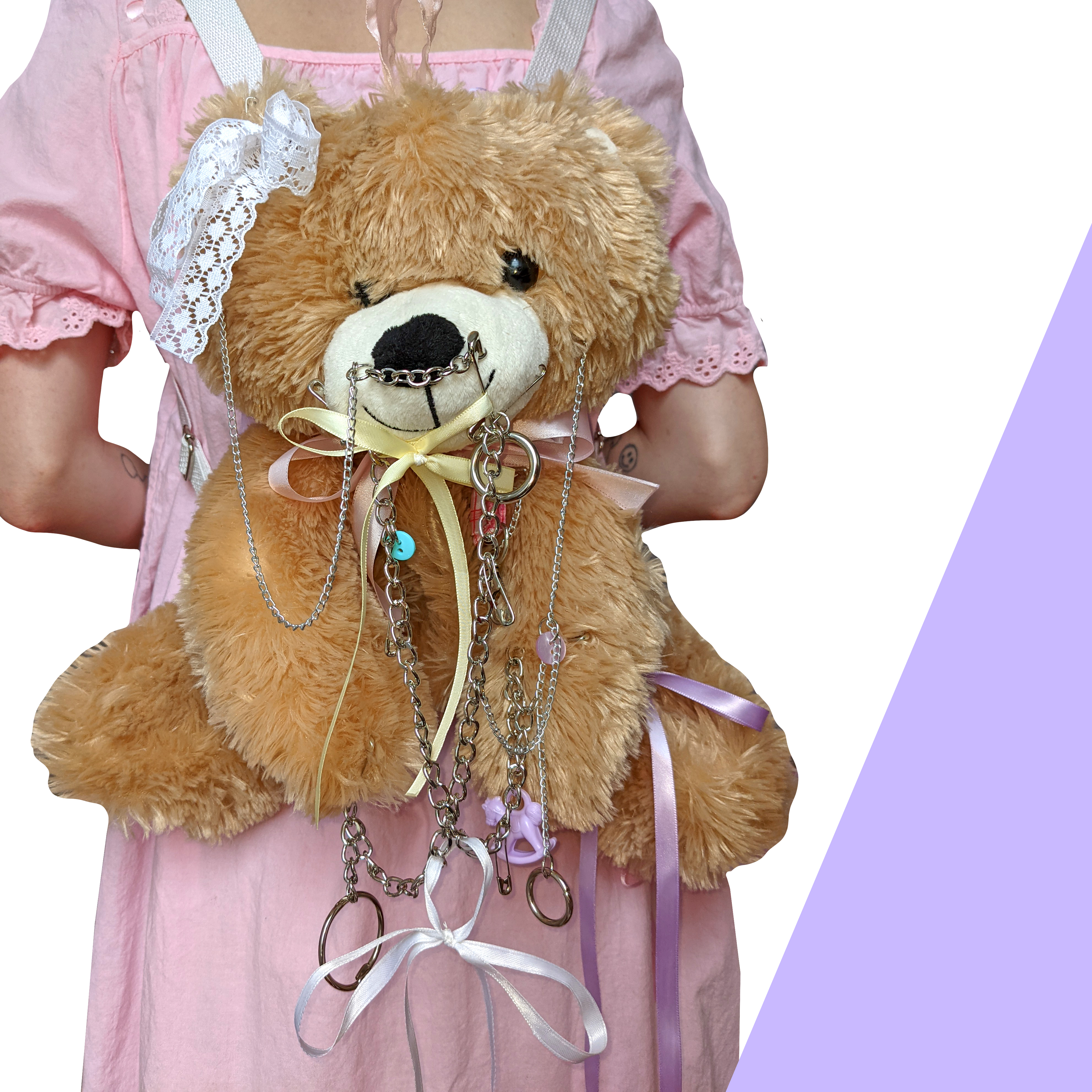 ︎ Teddy stuff reworked into bpack, hand-sewn & adorned with so many chains n ribbons! Opening is around 4 inches and can hold smaller items ︎