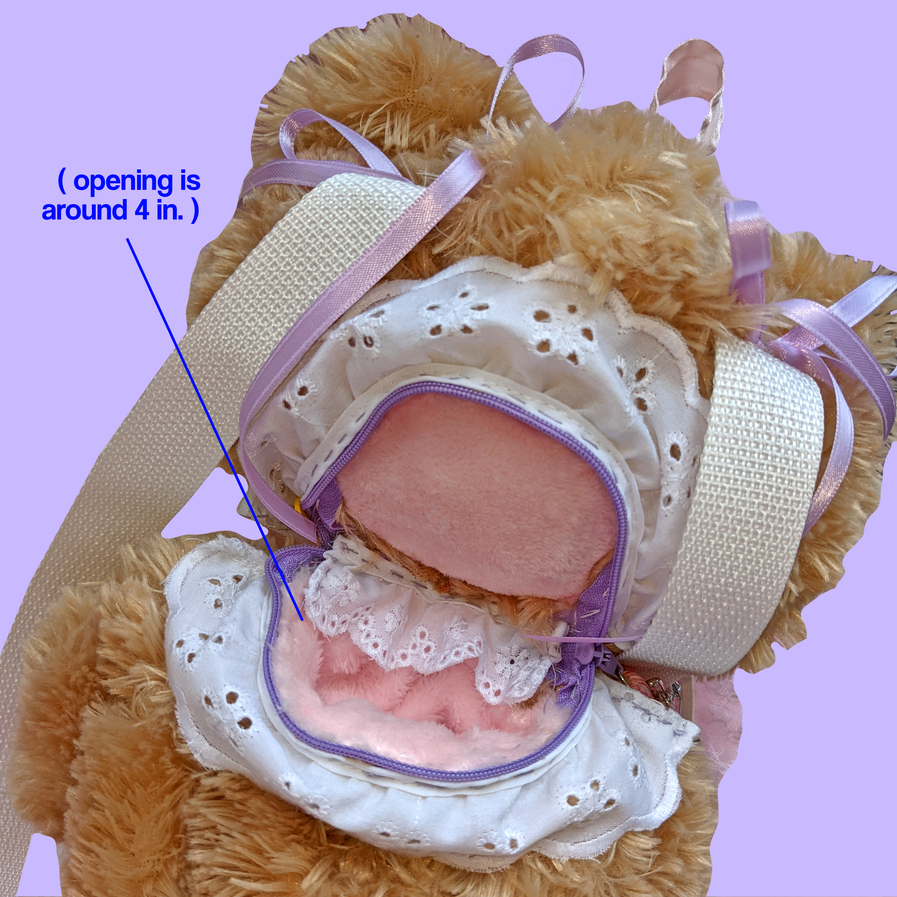 ︎ Stuffy reworked into backpack! Hand-sewn ~ the zipper is a little wonky on this one and can get stuck, so tug very gently. Opening is around 4 inches ︎